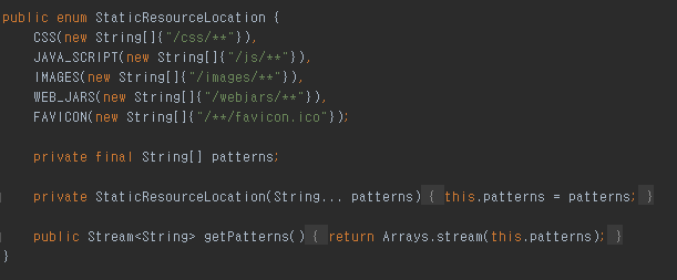 소스를 보면 enum 타입으로 정의 되어 있는 css, image, favicon.ico 등의 요청 경로를 추가해주는 것을 알 수 있다.