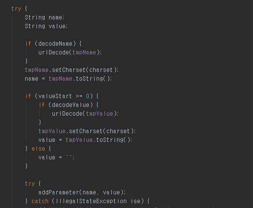 이처럼 파라미터가 생성(접근)될때 url디코딩에 대한 부분이 보이고 캐릭터 셋에 맞춰서 파라미터에 추가하는것이 확인된다.