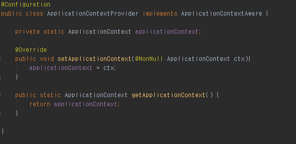 그럴경우 ApplicationContextAware 인터페이스를 구현한 클래스를 빈으로 등록하여 사용하면 된다.