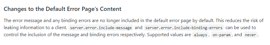 버전 변화로 인해 디폴트로 더이상 BindingExcption 대해서 발생원인에 대한 많은정보를 담고 있는 정보를 메세지에 담아서 보내지 않는다.