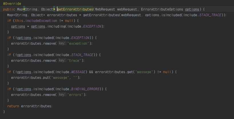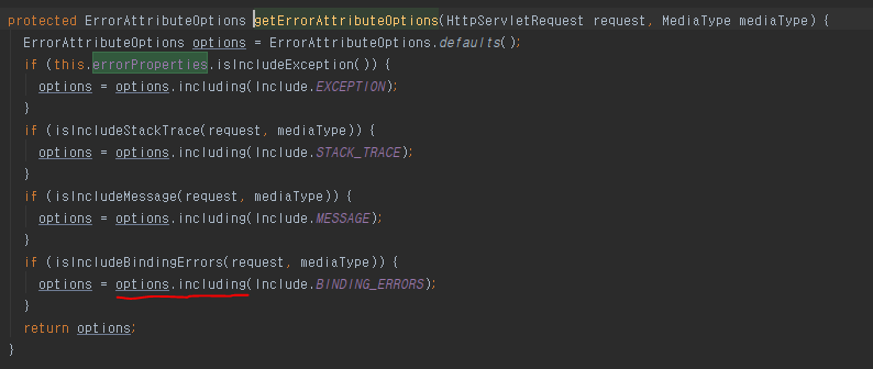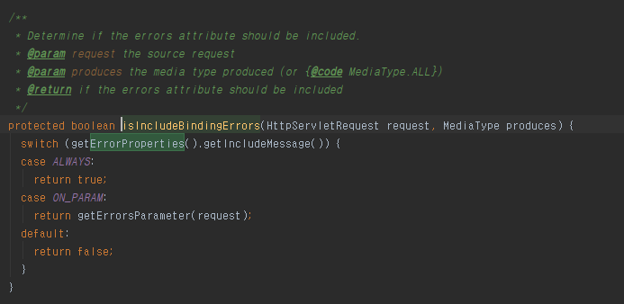 스프링 부트 2.3.x 버전 이전에는 이에 대한 프로퍼티가 있지 않았고 디폴트로 항상 메세지에 errors를 포함했다.